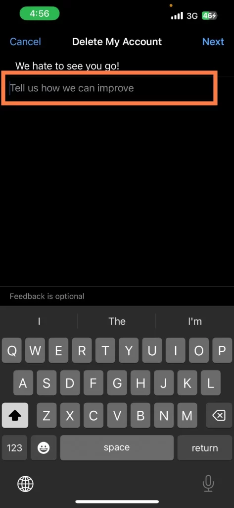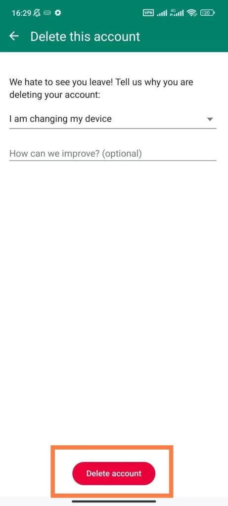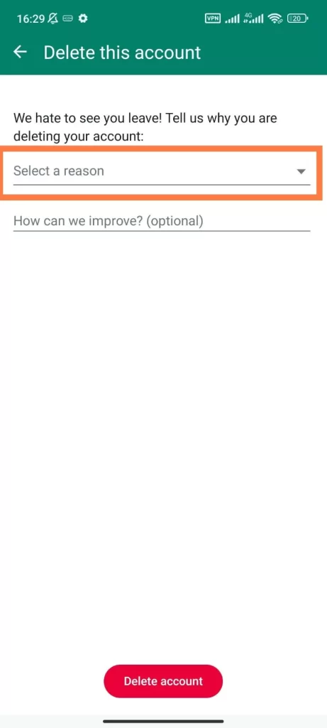 ۳. در گام بعد دلیل حذف حساب خود را وارد کنید.