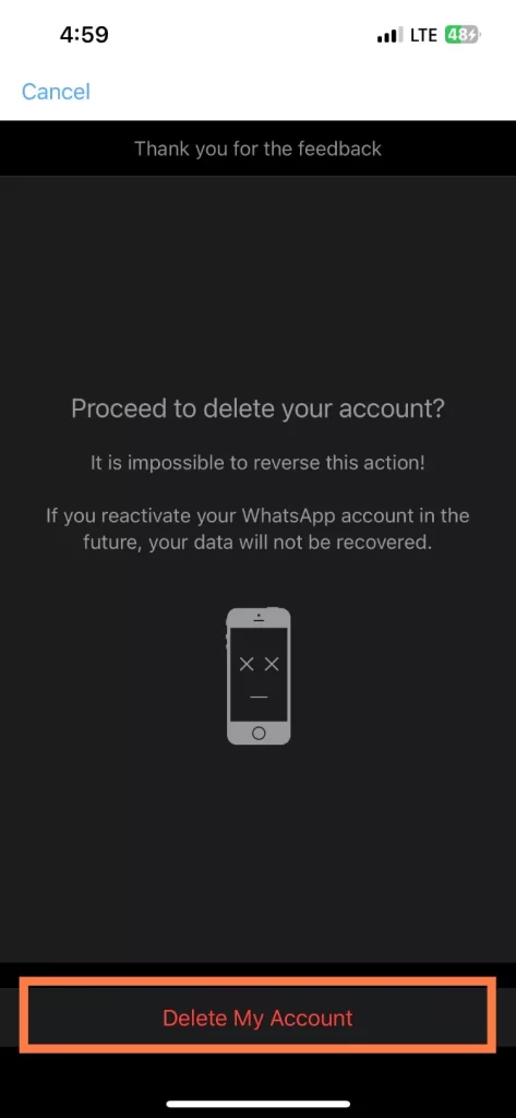 ۴. روی Delete My Account کلیک کنید تا حساب کاربری واتساپ شما بهطور کامل و برای همیشه حذف شود.