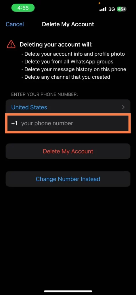 ۲. شماره موبایل خود را وارد کنید و روی Delete My Account ضربه بزنید.